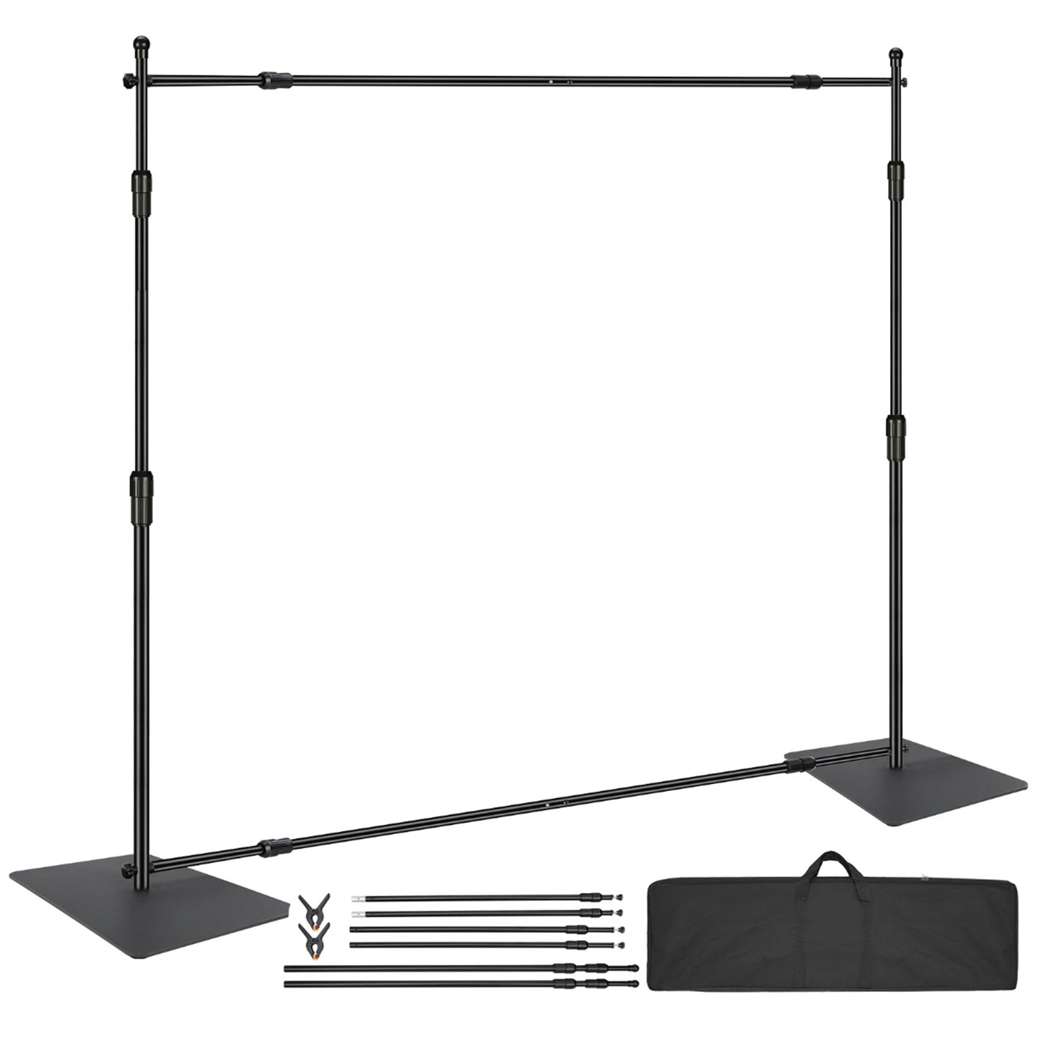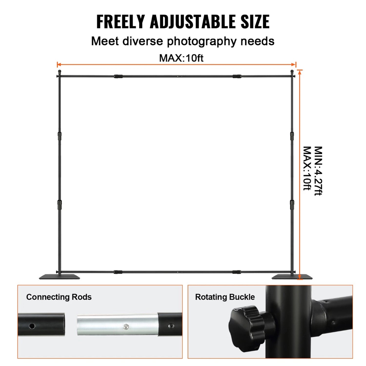 This squre shaped foot backdrop stand boasts a carbon steel base for exceptional stability and durability, supporting a maximum weight of 11 lbs. Its adjustable dimensions make it perfect for various backdrops, catering to your needs in wedding, professional studios, home setups, hotels, or stages. The pole height of the pipe and drape kit ranges from a minimum of 3.3 ft to a maximum of 10 ft. You can easily adjust it to meet different needs. Our heavy-duty backdrop stand is equipped with two heavy-duty clamps. These are designed to securely clamp anything to the frame, helping you fasten the backdrop fabric tightly and wrinkle-free. Whether you're a professional photographer, a photography enthusiast, need a professional studio backdrop, product display background, DIY photo booth, wedding or party decoration, our pipe and drape stand can meet your requirements. You will benefit from its portable design. It enables quick assembly and disassembly, saving you time and effort.